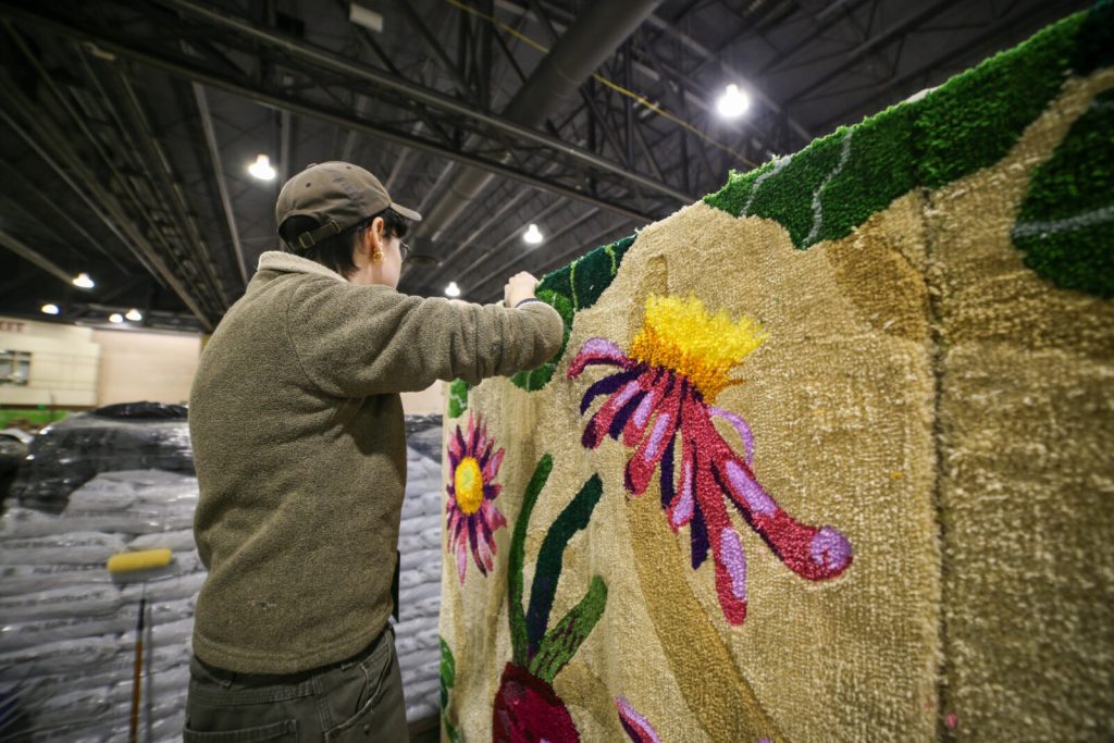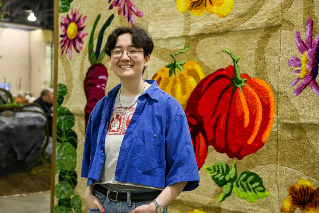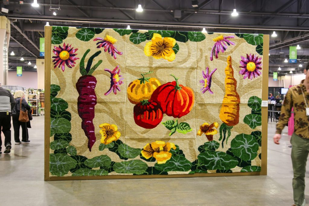 Artist Statement: The Flower Show this year is all about looking forward and envisioning a future full of abundance. What gives me hope for that vision is the wealth of knowledge we already have at our disposal. I wanted to make a piece highlighting the specific practice of companion planting as an example of a technique with a long history and many current applications. Companion planting is a technique of growing different kinds of plants together for the mutual benefit of the different plants. You may be familiar with the very famous example of the Three Sisters, a combination of beans, squash, and corn developed and used by indigenous communities across North America and Mesoamerica. The beans absorb nitrogen from the air and convert it into nitrates in the soil, the squash provides ground cover, and the corn stalk makes a pole for the beans to climb. This kind of planting is in opposition to a monoculture, where you might see an entire field of just one crop. In this piece, you’ll see nasturtiums, purple aster, basil, tomatoes, and carrots. Carrots’ long taproots help aerate the soil and combat compaction. Basil deters many common garden pests and also helps intensify the flavor of nightshades like tomatoes. Purple asters attract pollinators, and nasturtiums draw pests like aphids to themselves over the delicate tomatoes, leaving the fruit protected and the pests much easier to deal with on the heartier flowers. All this to say, companion planting makes it possible to set up your garden, be it in a window box, a backyard, or a community, to prioritize diversity, protect our vulnerable members, and cultivate beauty. This rug was made using a hand-held tufting machine, which punches yarn through an open-weave fabric stretched on a frame. The yarn is secured with glue on the back and then sheared to create an even texture across the surface.