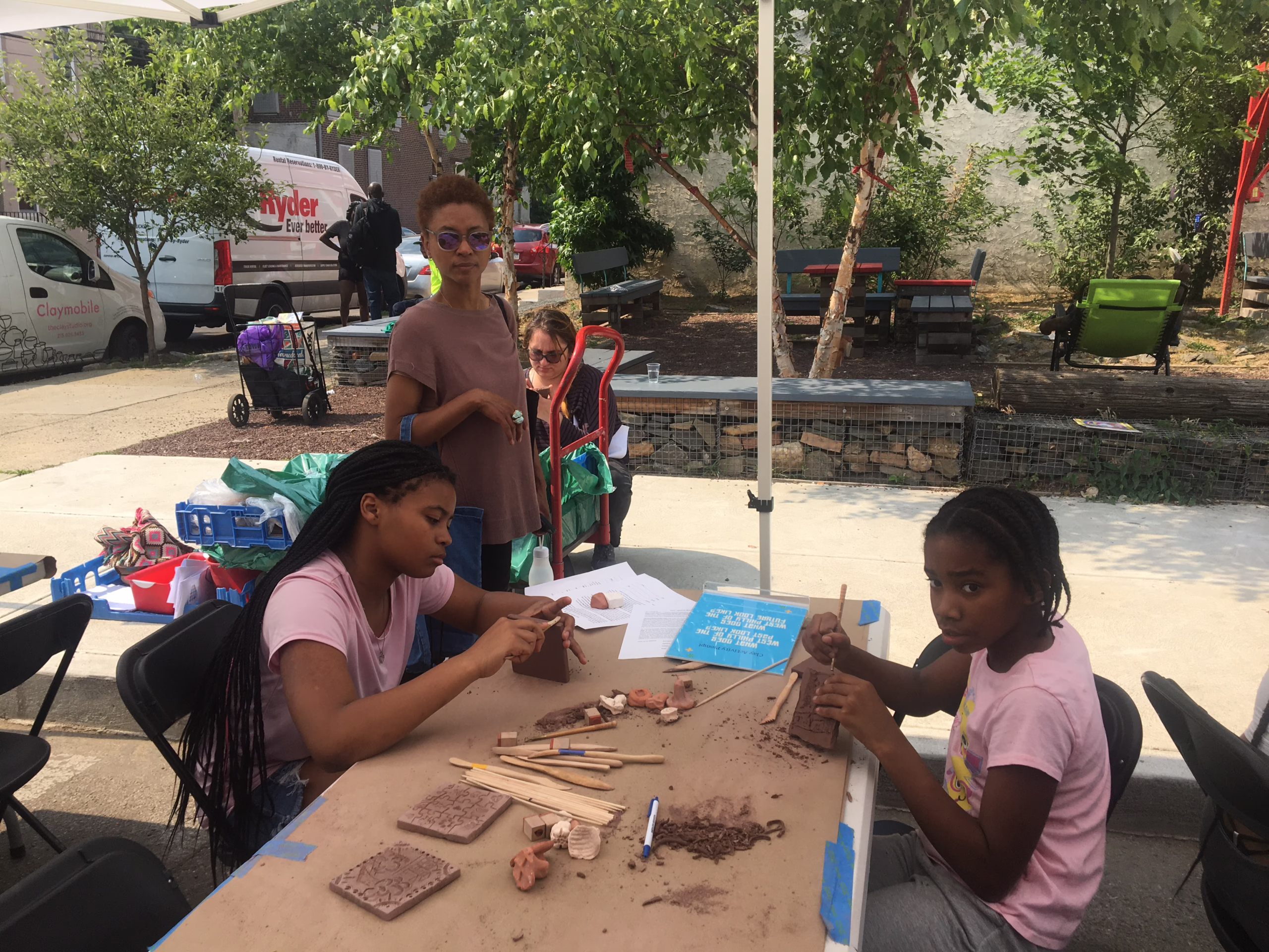 The installation is designed to be welcoming to people in all these communities and beyond, as well as to serve as a visual icon and functioning gathering place. It consists of 14 undulating sculptural “ribbons,” meant to energize the space, bring joy and suggest idea of dancing, an art form that has strong roots in this community. The stories and sounds that were collected at the block parties, along with original musical compositions, will be audible in the space at certain times of day and create a multi-sensory experience that evokes memory and place. Finally, the installation includes clay tiles, handmade by community members, reflecting their personal memories of the neighborhood.