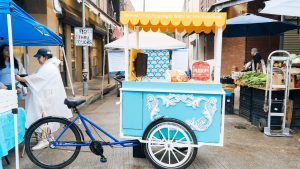 The Our Market project unveiled several new project components during the South 9th Street Italian Market Festival in May. Led by artist Michelle Angela Ortiz in partnership with Mural Arts Philadelphia, the project unveiled the Our Market Story Cart, designed by Ortiz and inspired by the Market’s push carts. The cart will serve as a tool to collect stories along different sites in the Market (butcher shops, restaurants, hair salons) on select Saturdays from June through July. All the stories will be added to the Our Market open-source digital archive.