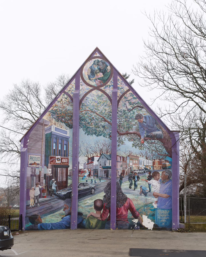 On the back of Mount Tabor Church, Growing Up in Germantown uses a traditional triptych (three-part) style with a stained glass effect at the top, representing this family-friendly neighborhood. The project was created with artists from the Center in the Park, Germantown High School, Pennsylvania School for the Deaf, and Philadelphia Youth Corps.