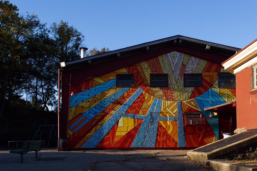 Sunshine Surrounds Us is located at Happy Hollow Recreation Center (Philly’s oldest!) where several prominent athletes and coaches got their start. The mural reflects the rec center’s warm history along with its bright future, depicting images from past and present, all surrounded by the colors of the sun’s rays.