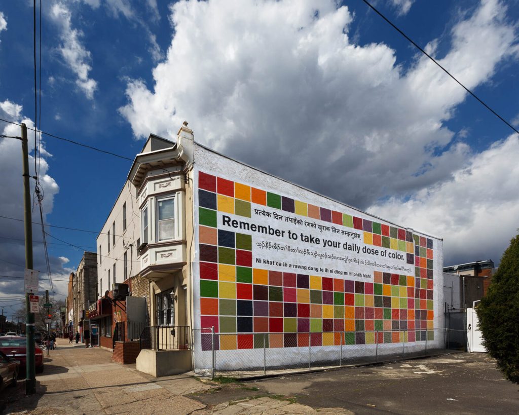 Nature Matching System is made up of colorful squares, corresponding to fruits and vegetables commonly eaten by immigrant communities in the area. Artist Tatfoo Tan asked locals what foods they often ate, and translated the simple text, “Remember to take your daily dose of color,” into the multiple languages that are present in the community: Karen, Chin, and Nepali.