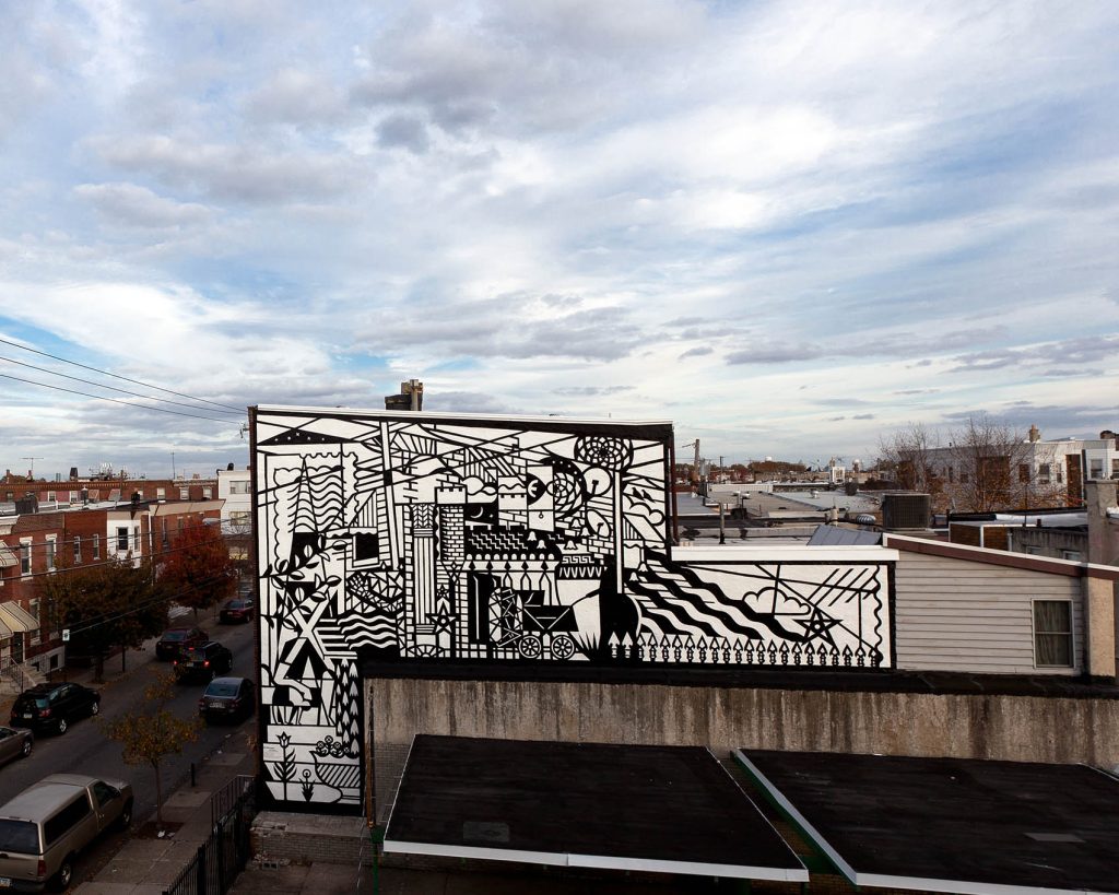 Artist Joe Boruchow designed this striking black and white mural to combine historical and current architectural elements from Philadelphia’s East Passyunk neighborhood. His linear, graphic style was influenced by longtime hero Keith Haring.