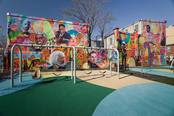 This mural covers the east and west walls surrounding Uncle David’s Universal Playground at 15th and Catherine Streets. Among the figures depicted are Frederick Douglass, Rev. Leon Sullivan, and a little girl named Shakira Hinton, a straight-A student at Universal Charter School, whose life was cut short in a tragic incident. The project was developed through a partnership between Kenneth Gamble’s Universal Companies and the City of Philadelphia.