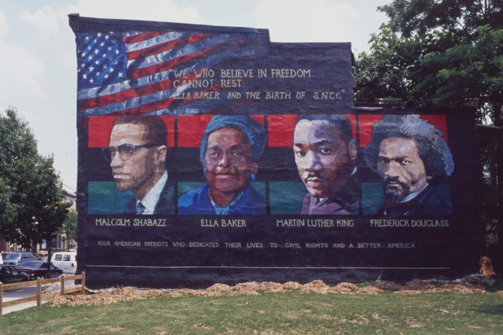 The mural features portraits of four Civil Rights legends: Malcolm X, Martin Luther King Jr, Ella Baker, and Douglass. The title comes from a speech Baker gave in 1964 and this line: “Until the killing of black men, black mothers’ sons, becomes as important to the rest of the country as the killing of a white mother’s son, we who believe in freedom cannot rest.”