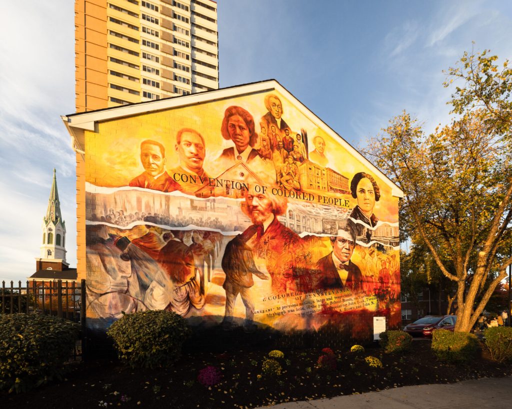 Two murals on the same block commemorate the inaugural “Colored Convention” in Philadelphia in 1830, a gathering of Black American leaders who came together to politically organize and advocate not only the abolition of slavery in southern states but also for equal education, voting rights, and other social justice issues in free states. Douglass’s image is unmissable in one of the murals.