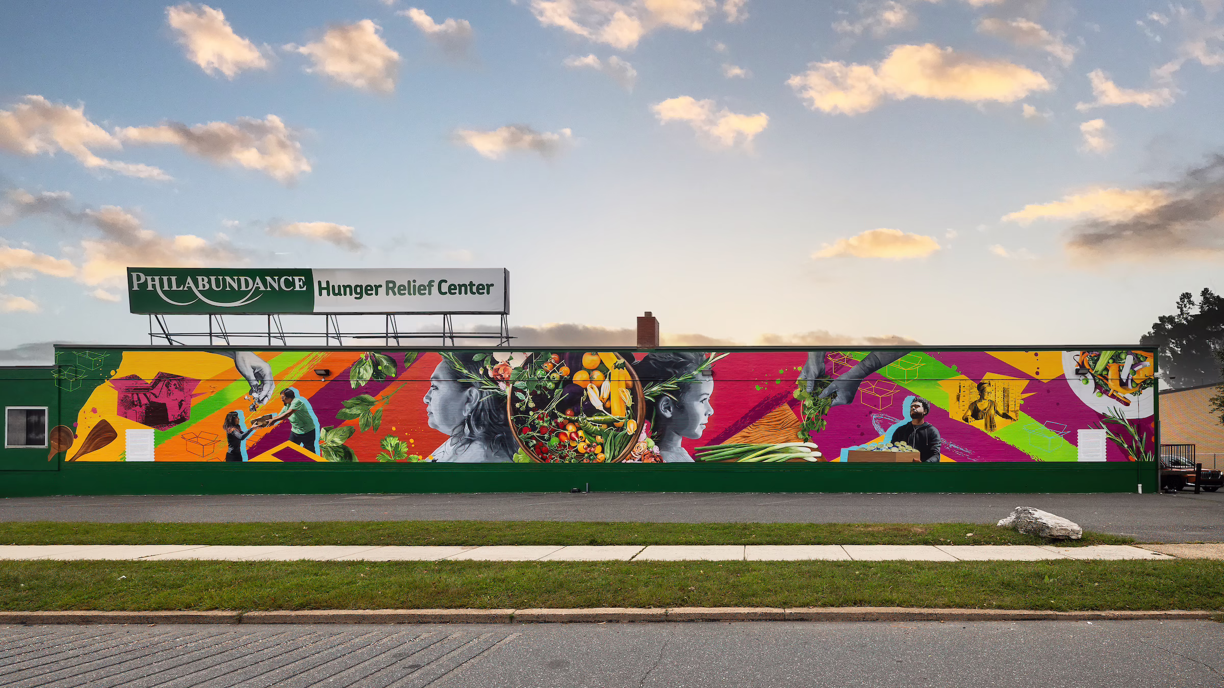More than Food is a mural by Carlos “Calo” Rosa at Philabundance’s Hunger Relief Center, located on Pattison Avenue in Philadelphia. This captivating and colorful mural aims to bring new life to South Philadelphia and to celebrate the impact of Philabundance’s work in the community. The mural was dedicated in September 2023 to highlight the nationally recognized Hunger Action Month.