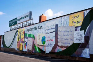 In 2011, world-renowned artist Meg Saligman collaborated with artist Jenna Price and Writers Matter Program Director Bob Vogel to create a customized program for 23 students at the Northwest Regional Talent Center. During this program, students were encouraged to express their thoughts on hunger in their community through writing and a variety of art projects. One session consisted of a trip to a food pantry to see how their neighbors in need acquire food. The project aimed to unite the voices of Philadelphia’s youth through writing and art in a final public artwork on Philabundance’s wall, promoting social change and inspiring action.