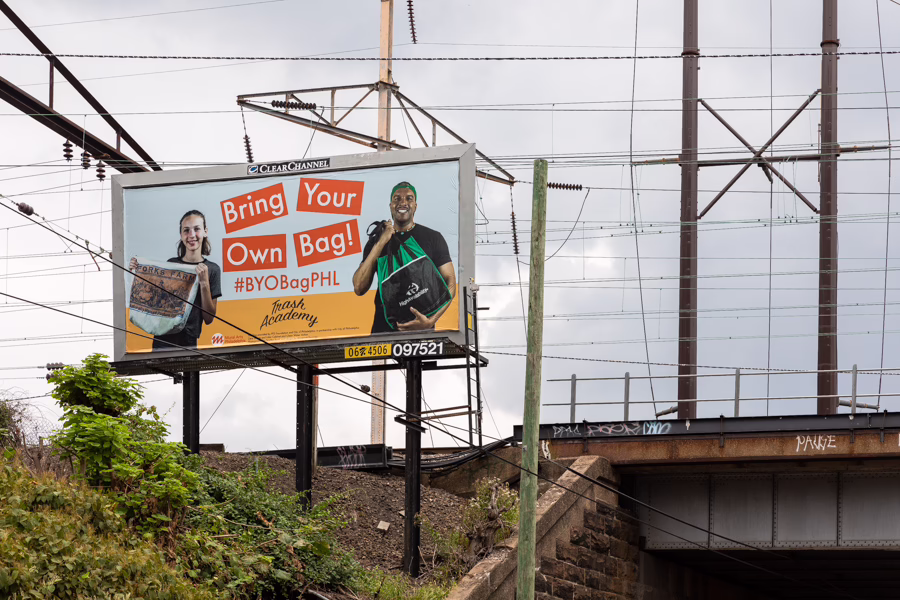 The #BYOBag billboards were designed by artist Margaret Kearney, with photography from Teishka Smith. Funded by the PTS Foundation and City of Philadelphia; in partnership with the City’s Zero Waste and Litter Cabinet and Clean Water Action.