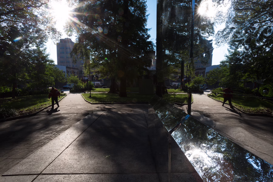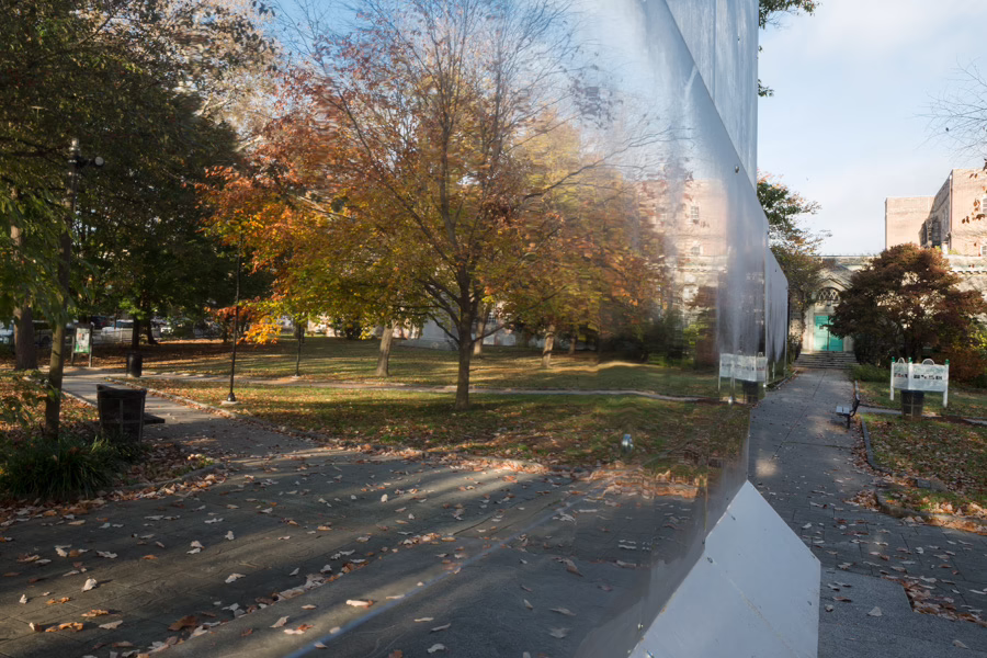 I’m always thinking about the complexity of history—monuments represent a single perspective, and single perspectives are always false. What does it mean to take the history of the Pastorius Monument, and combine it with the Battle of Germantown Memorial? The only reason why this monument exists is George Washington, and the powerful figure that he still is. He was fighting for America’s freedom while owning slaves. So how could I overlay these complex histories? I didn’t want to just repeat history—it had to reflect the present moment. So the mirror reflects a predominantly African American neighborhood. If it was mirrored, I knew the structure would disappear, in conversation with the Confederate monument controversy. I still wanted it to be monumental, so when you get up close, it goes from being invisible to taking on a monumental presence, even bigger than the original. When you get up close, you also see yourself in it. Monuments are about people—they’re about our humanity, or they should be. They should reflect our humility and our humbleness, the complexity of what it means to be human.