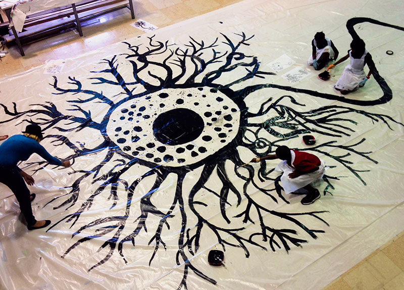 Volta instructed his students to draw “tons and tons of neurons.” So long as the drawing had dendrites, a nucleus, and an axon – it was a neuron. “The kids could draw it as crazy and funky as they liked. As long as it had the components of the brain cell it was a brain cell.” The group researched more brain imagery and immediately fell in love with the colorful brain maps they found. Volta sought the help of experts in the field to help students understand more about the brain and thought patterns. The class had an incredible opportunity to Skype with experts at MIT, who showed them a slice of real human brain for artistic inspiration.