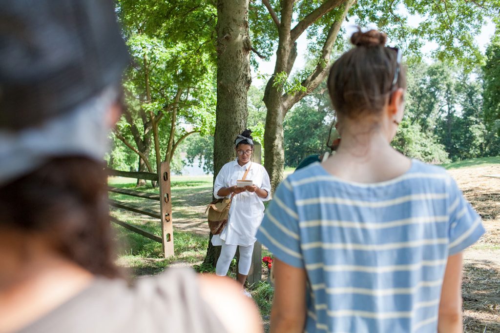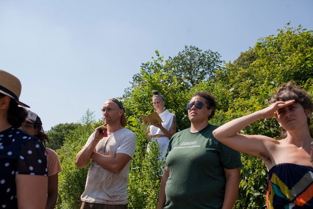 Althea: When we went on all the staff tours, we loved how the procession through the space was like a dance or a site-specific choreography. We picked up on this for our tour. We invited the staff to lie down under the Franklinia tree while they listened to a story about William Bartram’s rice plantation in Florida. We had them look through binoculars across the Lenni Lenape archeological site to see a dance performed on a pier on the other side. A lot of the pieces of the tour were building off information the staff had shared with us in the first place. We expanded on these pieces, both emotionally and historically, making them the center of the tour narrative instead of the margins.