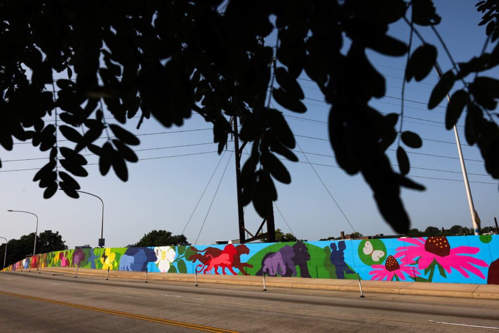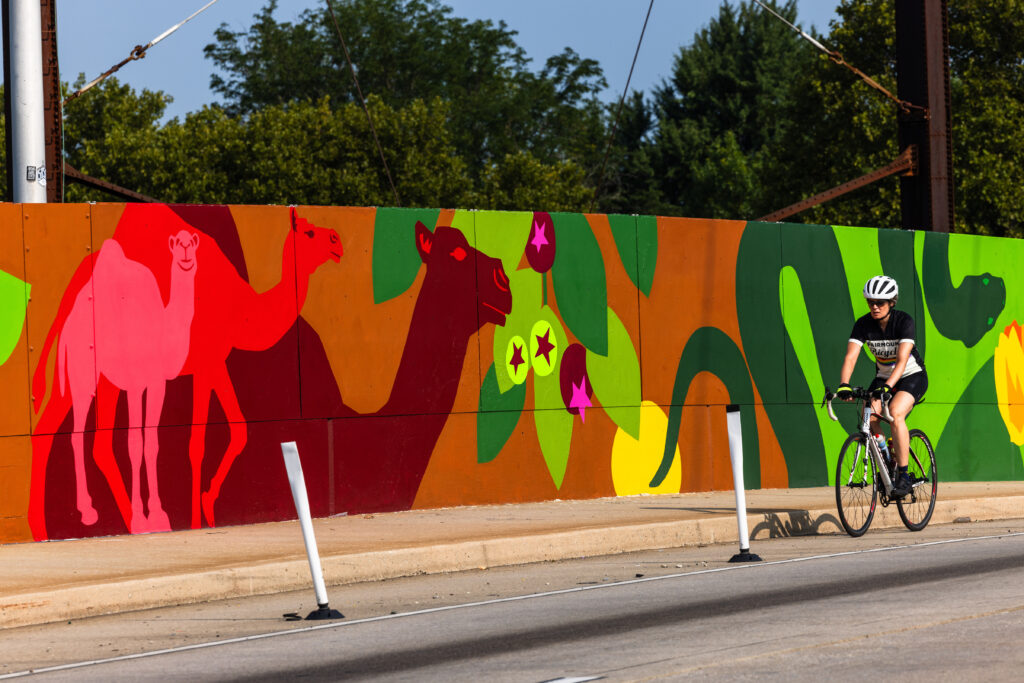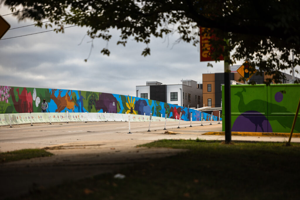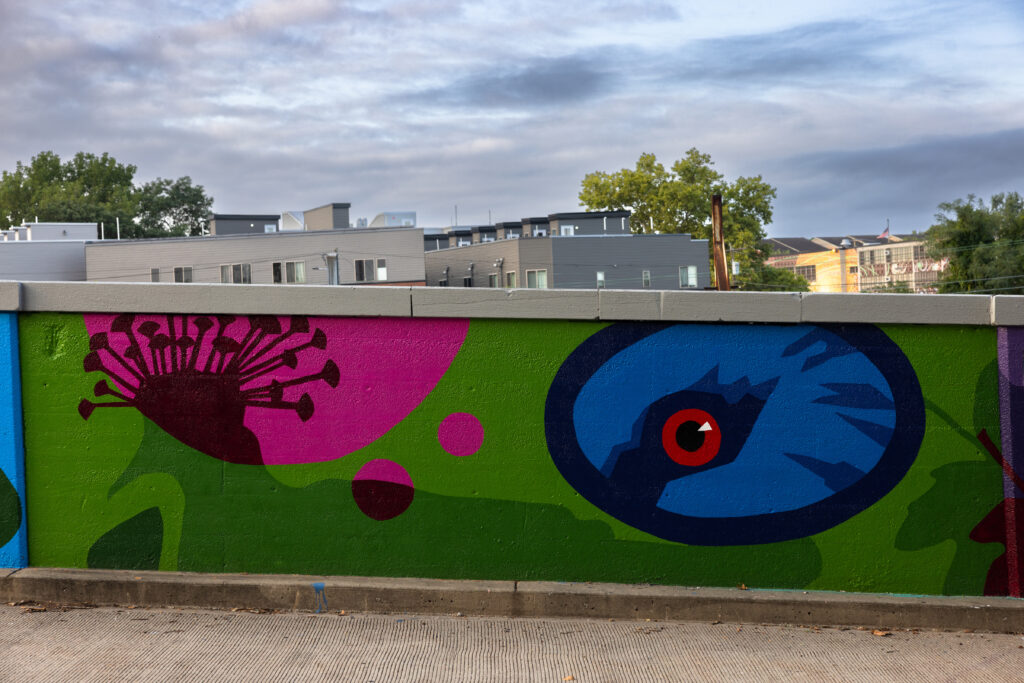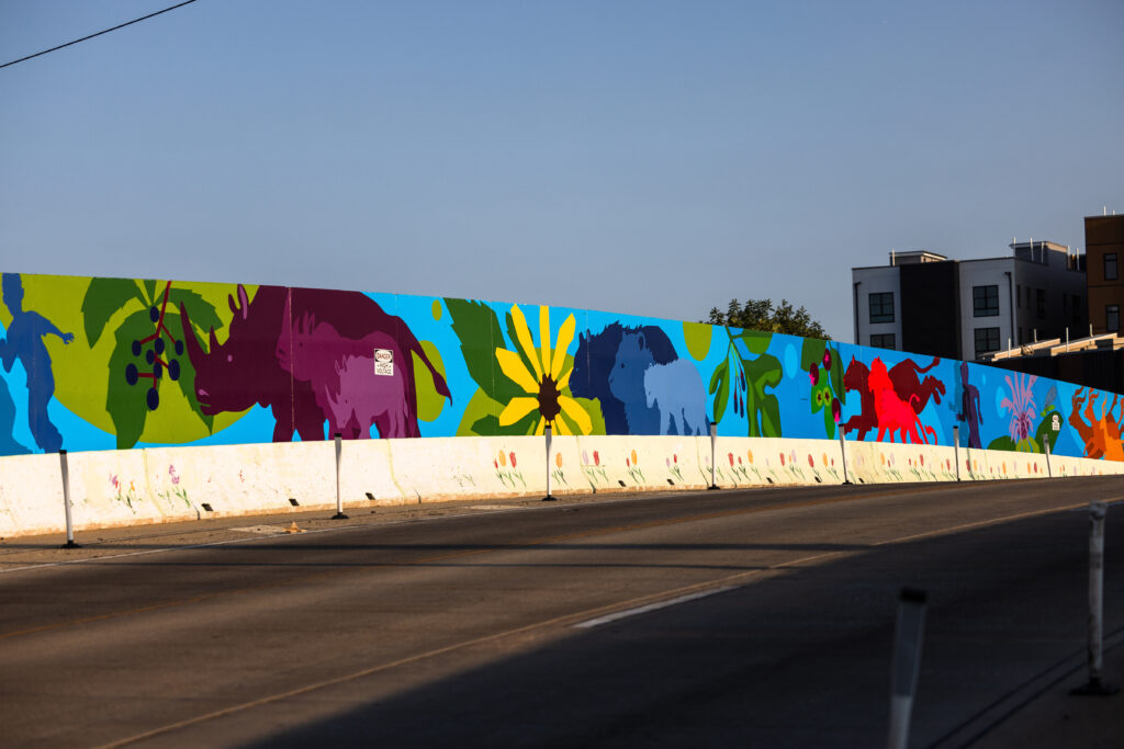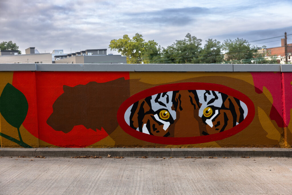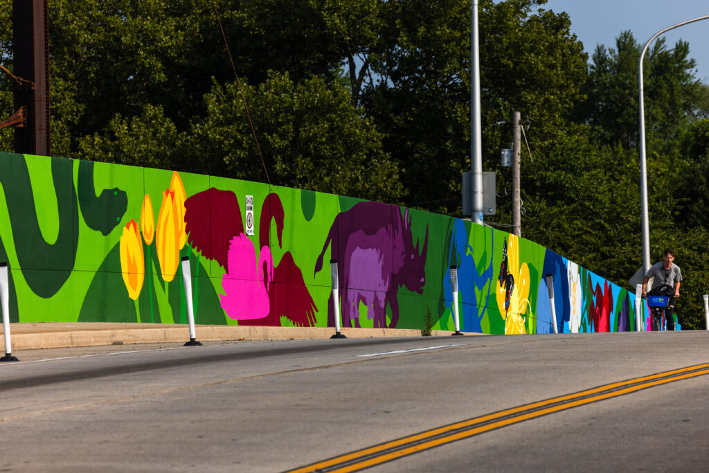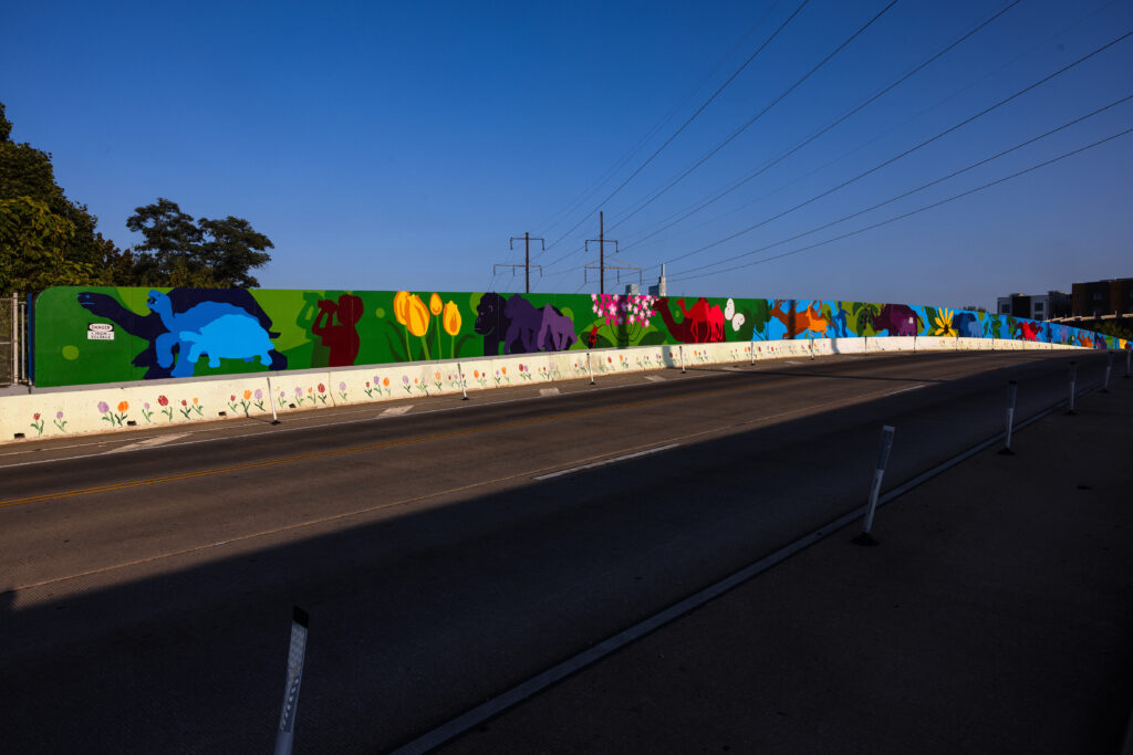 The full scope of this project includes a mural on the 34th Street bridge, a mural on Zoological Drive next to the Zoo’s Frog Parking Lot, and ten custom 5’x10’ of art that highlight the Zoo’s conservation work.