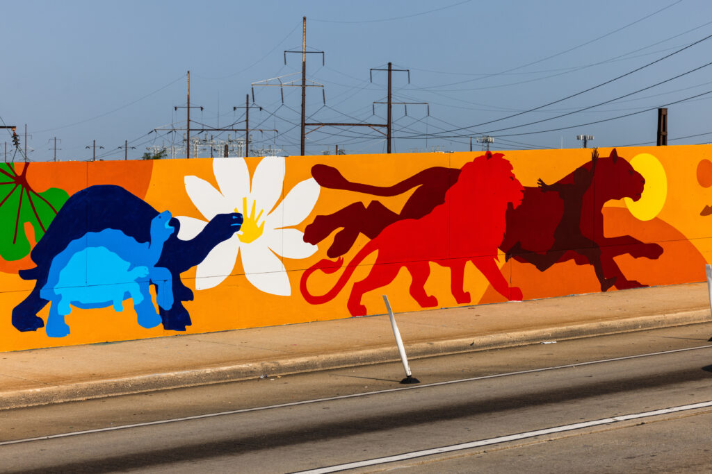 This past May, Mural Arts and the Philadelphia Zoo dedicated and unveiled brand-new works of art aimed at connecting the surrounding community to the Zoo and highlighting the vital conservation of the Zoo. The mural, painted by artists Eurhi Jones and David McShane with designs chosen by the surrounding neighborhoods, uses bright, jubilant colors to showcase the ecosystem that humans and animals share to depict a future where people and wildlife thrive together. The art also invites the Zoo’s nearest neighbors to learn more about how the Zoo and its 1,900 animals can be a more present part of their lives.