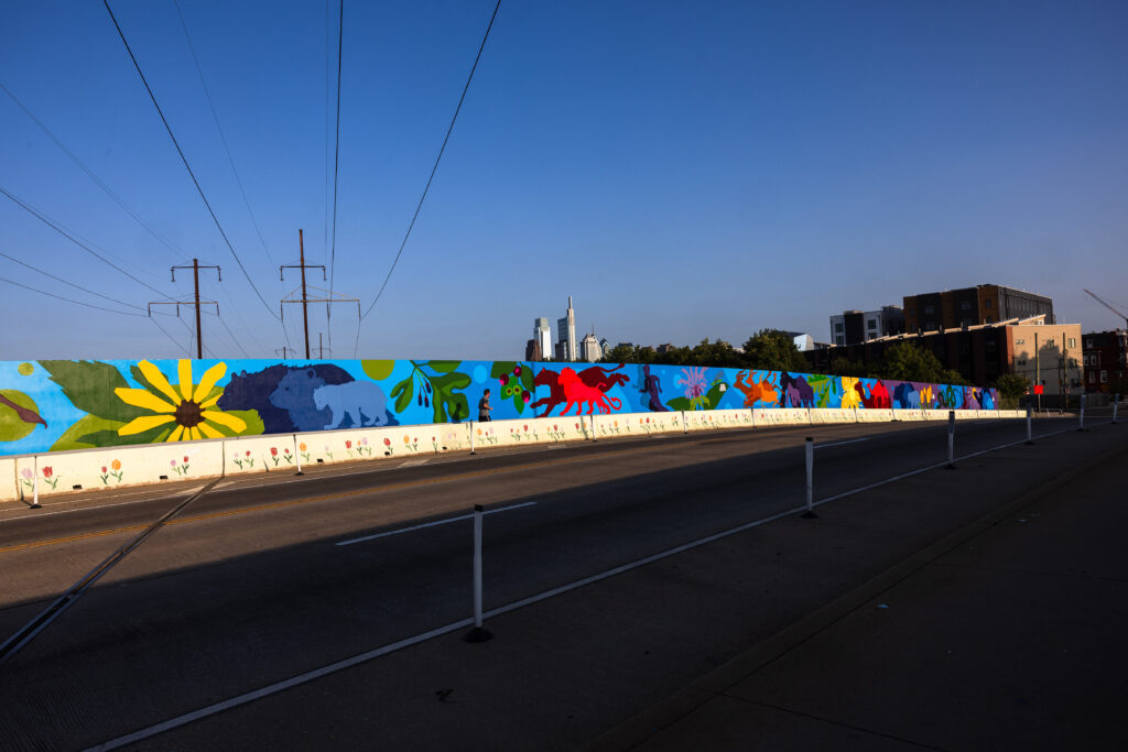 On the bridge, Jones and McShane leaned fully into the metal animal shapes that already existed and built upon them, creating different sizes of the same animal to depict animal families alongside silhouettes of skipping children. Animals include Galapagos tortoises, southern white rhinos, and golden lion tamarins, all animals that currently live at the Zoo. Tulips have become a key signal of Mantua and can be found throughout the piece. On Zoological Drive, this theme continues with eyes added to depict the connection individuals and animals can make with one another while visiting the Zoo. Along 34th Street, the panels highlight the worldwide conservation projects supported by the Zoo, as well as the different ways humans and animals rely on each other.