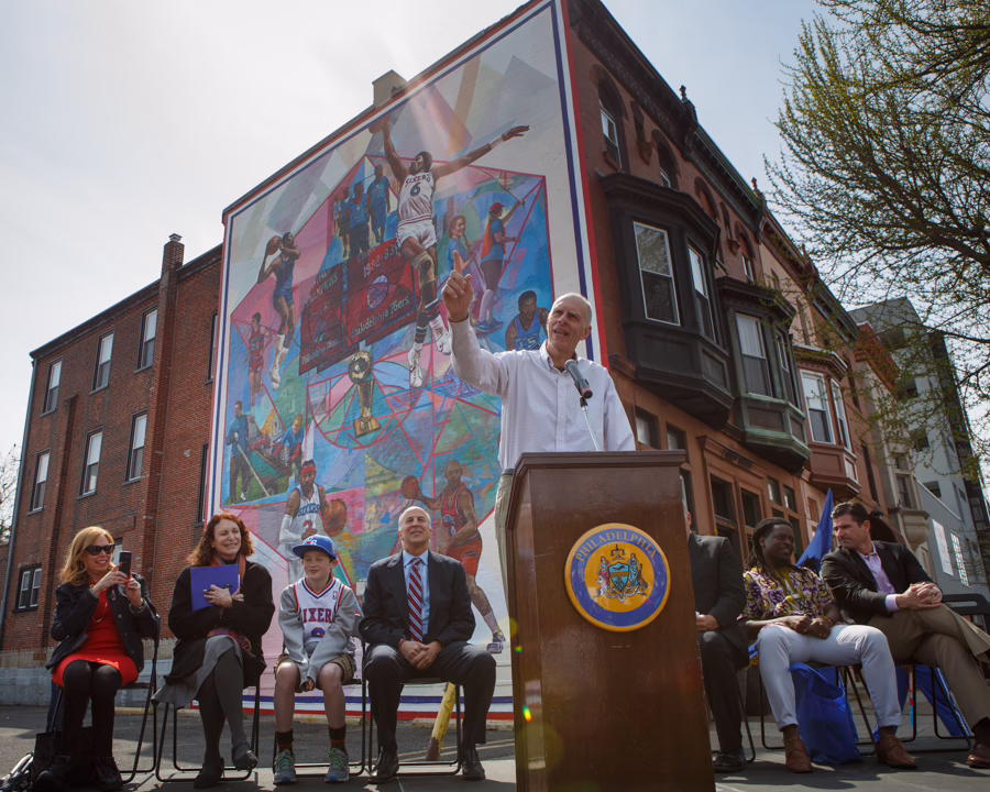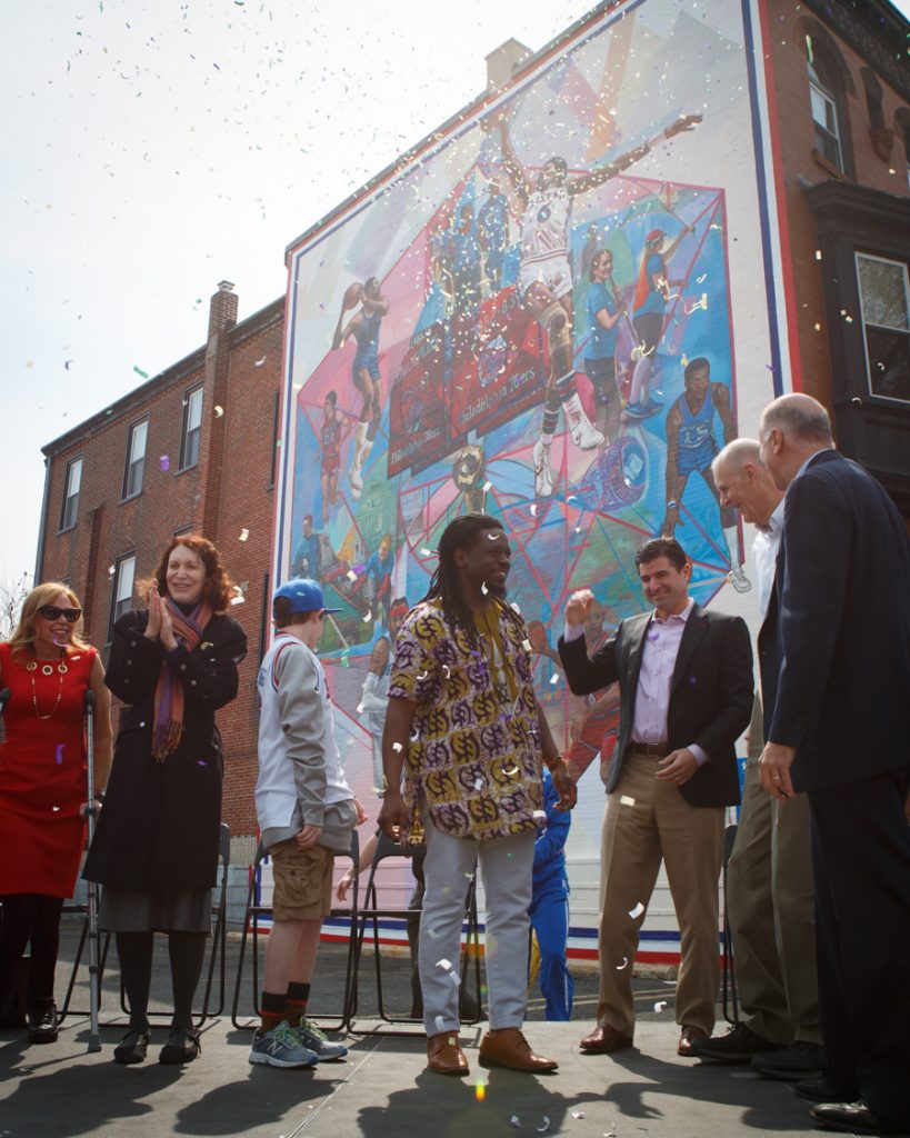 On Thursday, we dedicated 76ers: Beyond the Court, a brand new mural by artist Ernel Martinez. Located at Broad and Federal Streets in South Philadelphia, the mural honors the Philadelphia 76ers, and some of its most iconic players from the past. The celebration drew a big crowd, and plenty of press.