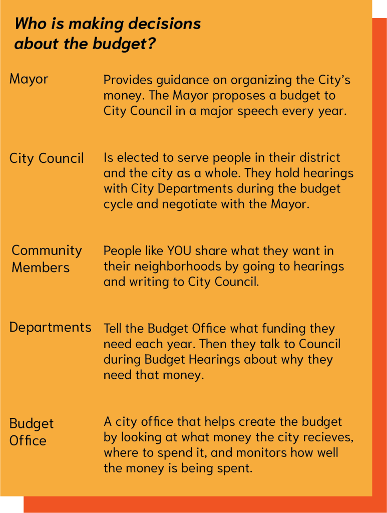 City Council Negotiations. Council holds budget hearings with various departments, gathers additional input, and negotiates with the Mayor’s Office to finalize the budget by June 30.