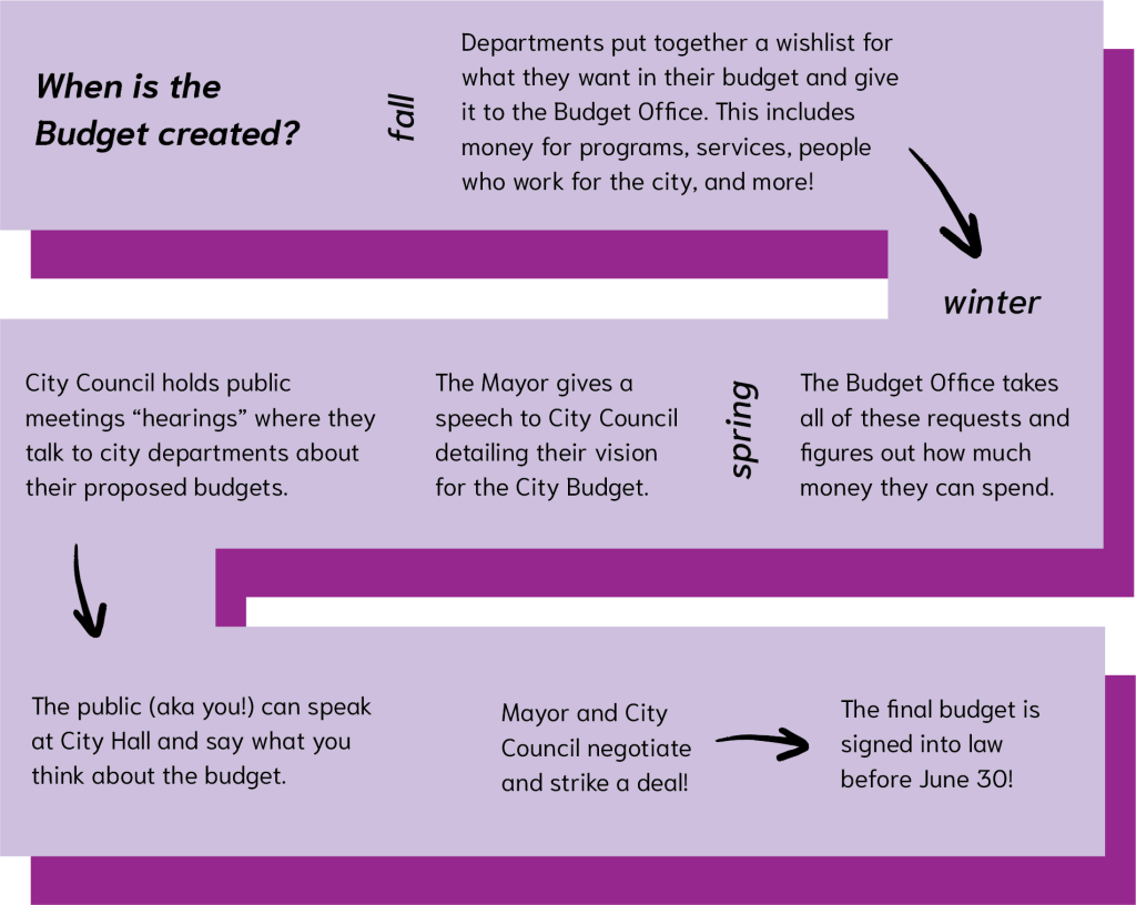 The city budget is more than just numbers—it’s a reflection of our city’s values and priorities. At the People’s Budget Office, we help Philadelphians understand how the city budget works, imagine what a fully funded city could look like, and find ways to advocate for change. Each year, we host Budget 101 workshops that explain the basics of the budget and how the process works. To make this knowledge accessible to everyone, we’ve created a quick and easy guide to understanding the city budget. You can also learn more by watching this short video from the City of Philadelphia’s Budget Office.