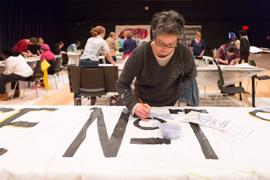 It all started with a March 21 panel discussion in partnership with the Kimmel Center for the Performing Arts. Artists Olek and Michelle Angela Ortiz, Councilwoman Helen Gym, and Liza Goodell from Spiral Q—all active agents for social change—talked through their thoughts and experiences around art and protest. At events on March 24 and April 8, Signs of Solidarity co-led sign-making workshops with artists Sheldon Abba + Bruno Guerreiro and Martha Rich. Sign-making is all about speaking up and being part of the conversation, using visual language to turn up the volume.